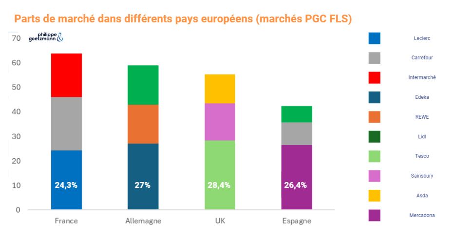 Désormais, le retail français est le plus concentré des grandes économies européennes : les trois 1ers acteurs (Leclerc, Carrefour, Intermarché) pèsent près des 2/3 du marché des produits de grande consommation.